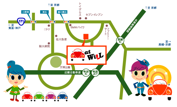 名神高速茨木インターから東へ2km。下井町交差店を左折して頂いて約800m直進の右側です。 お手数ですが、ご来店の際は在庫確認等のお電話下さい。(TEL: 072-641-8883)